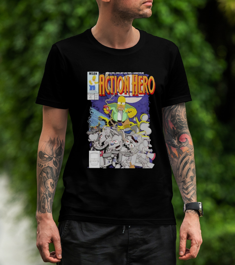 The MSAN The Simpsons Action Hero With A Dry Cool Wit I Could Be An Action Hero With Mouse Robot T-shirt is designed for everyday wear and a consistent fit. Fabric is pre-shrunk ring-spun cotton with durable stitching. See the size chart below for exact measurements.