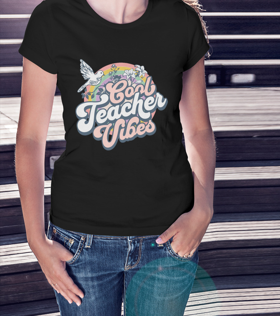 Cool Teacher Vibes Retro Rainbow Floral Design With Dove T-Shirt
