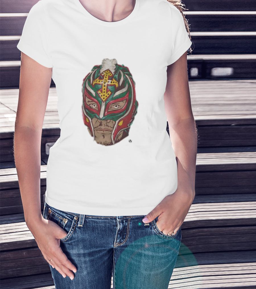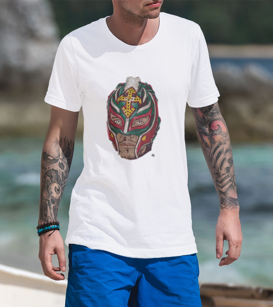 Men's Black Rey Mysterio Mask Face With Colorful Wrestling Headdress And Cross T-Shirt