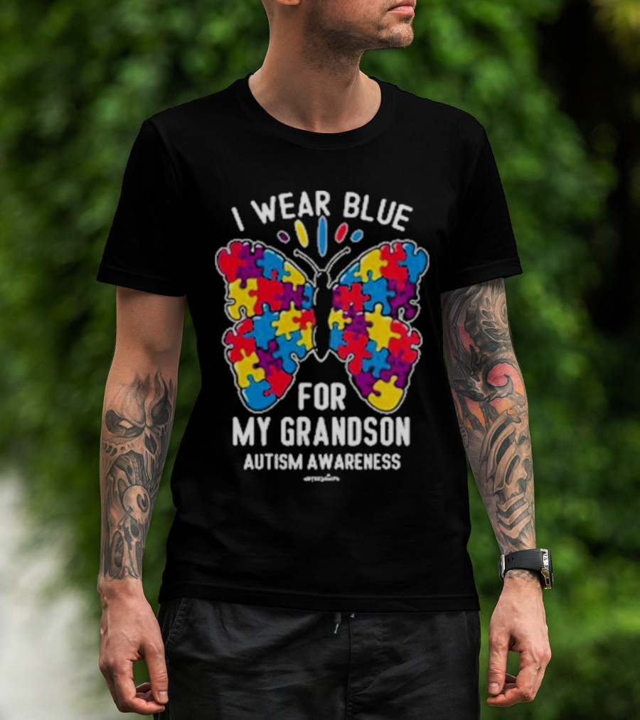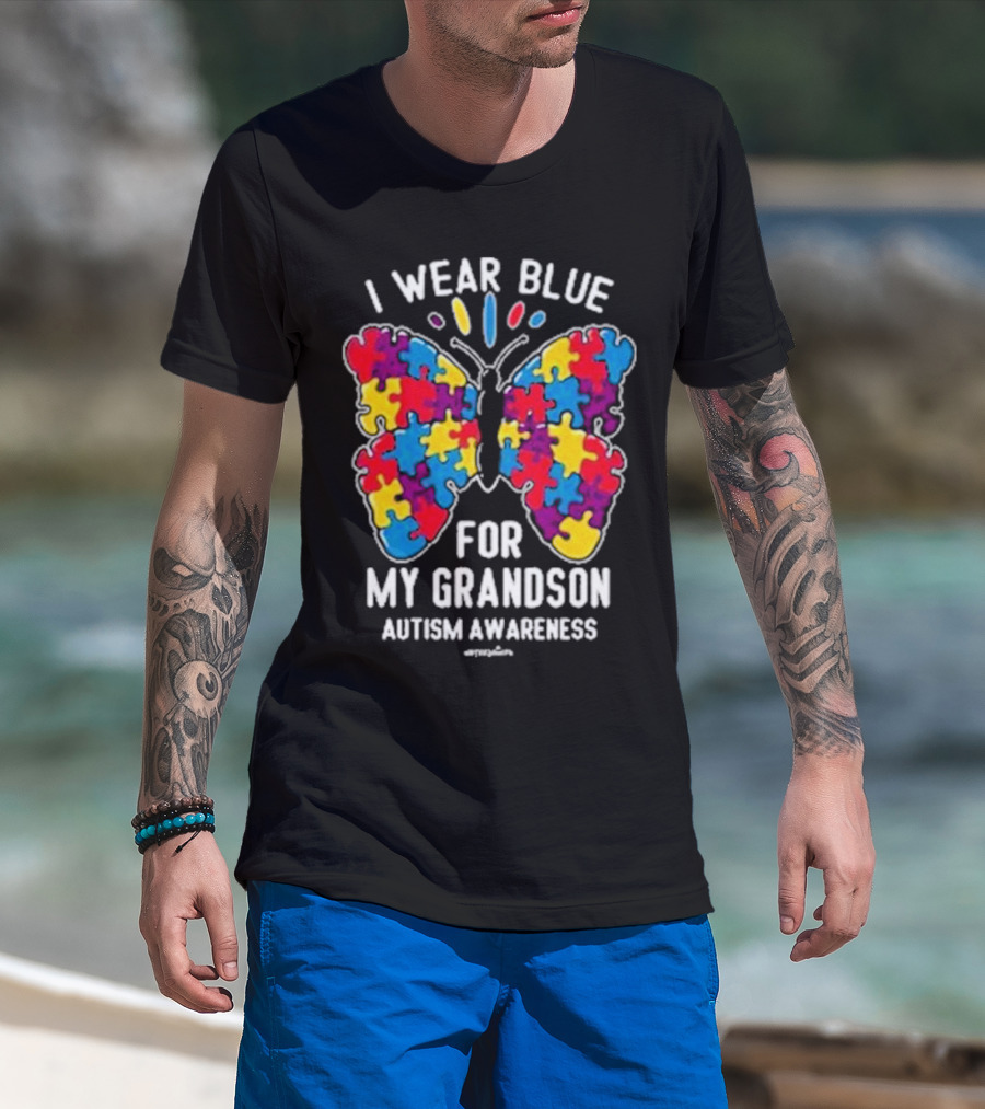 I Wear Blue Butterfly Puzzle My Grandson Autism Awareness T-Shirt