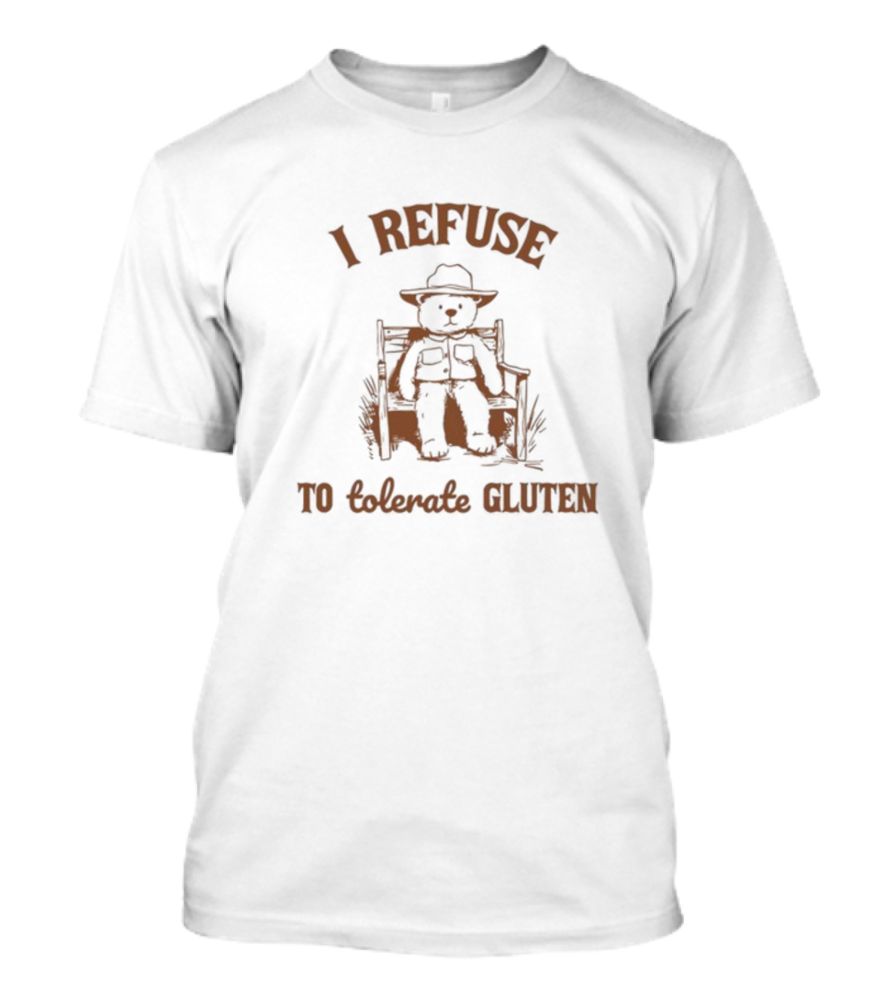 The I Refuse To Tolerate Gluten Oldschoolcult Bear in Chair T-shirt is designed for everyday wear and a consistent fit. Fabric is pre-shrunk ring-spun cotton with durable stitching. See the size chart below for exact measurements.