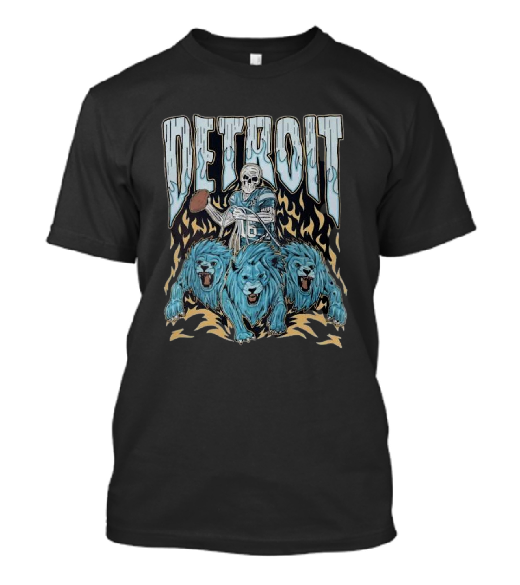 The Detroit Skull Quarterback with Football and Blue Lions T-shirt is designed for everyday wear and a consistent fit. Fabric is pre-shrunk ring-spun cotton with durable stitching. See the size chart below for exact measurements.