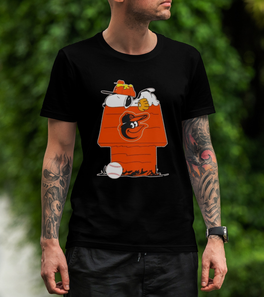 Snoopy And Woodstock Sleeping On Baltimore Orioles Themed Doghouse With Baseball T-Shirt