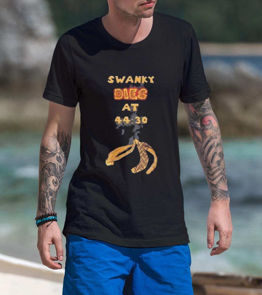 The SWANKY DIES AT 44:30 T-shirt is designed for everyday wear and a consistent fit. Fabric is pre-shrunk ring-spun cotton with durable stitching. See the size chart below for exact measurements.
