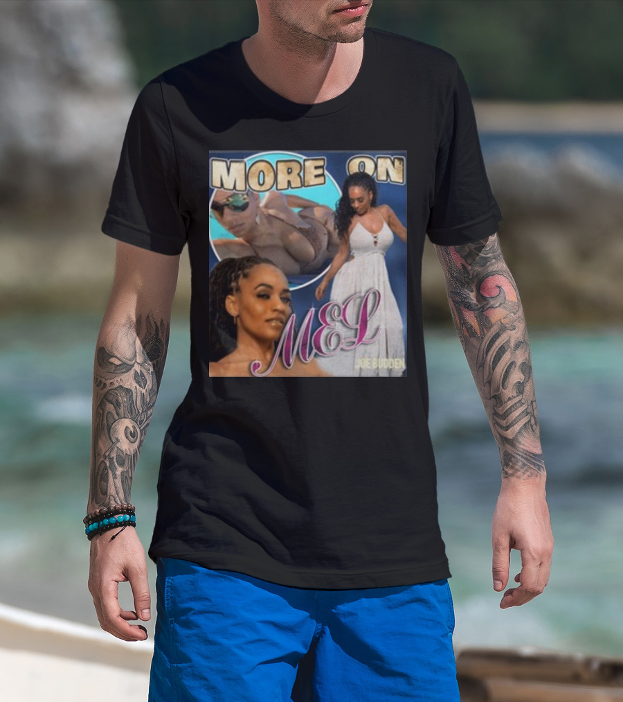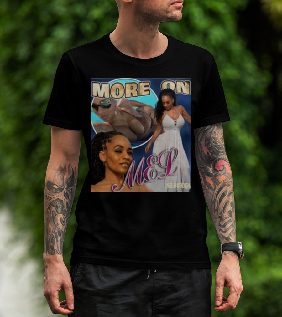 The More On Mel Joe Budden T-shirt is designed for everyday wear and a consistent fit. Fabric is pre-shrunk ring-spun cotton with durable stitching. See the size chart below for exact measurements.