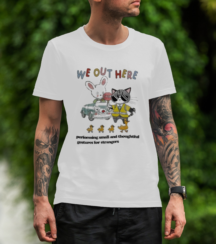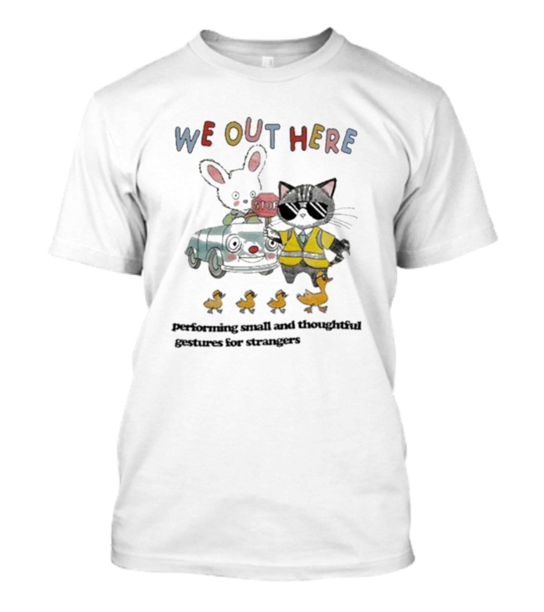 The WE OUT HERE Performing Small and Thoughtful Gestures for Strangers with Cat Crossing Guard and Ducklings T-shirt is designed for everyday wear and a consistent fit. Fabric is pre-shrunk ring-spun cotton with durable stitching. See the size chart below for exact measurements.
