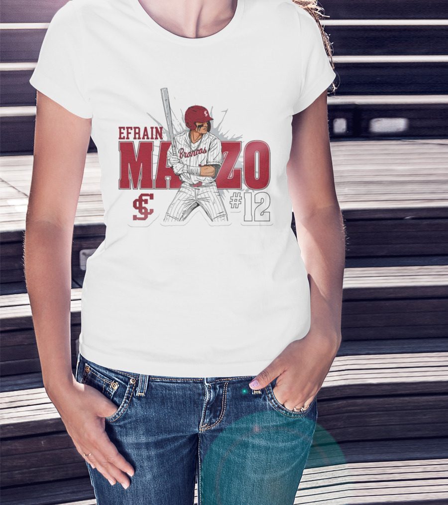 The Efrain Manzo SCU Broncos Baseball #12 T-shirt is designed for everyday wear and a consistent fit. Fabric is pre-shrunk ring-spun cotton with durable stitching. See the size chart below for exact measurements.