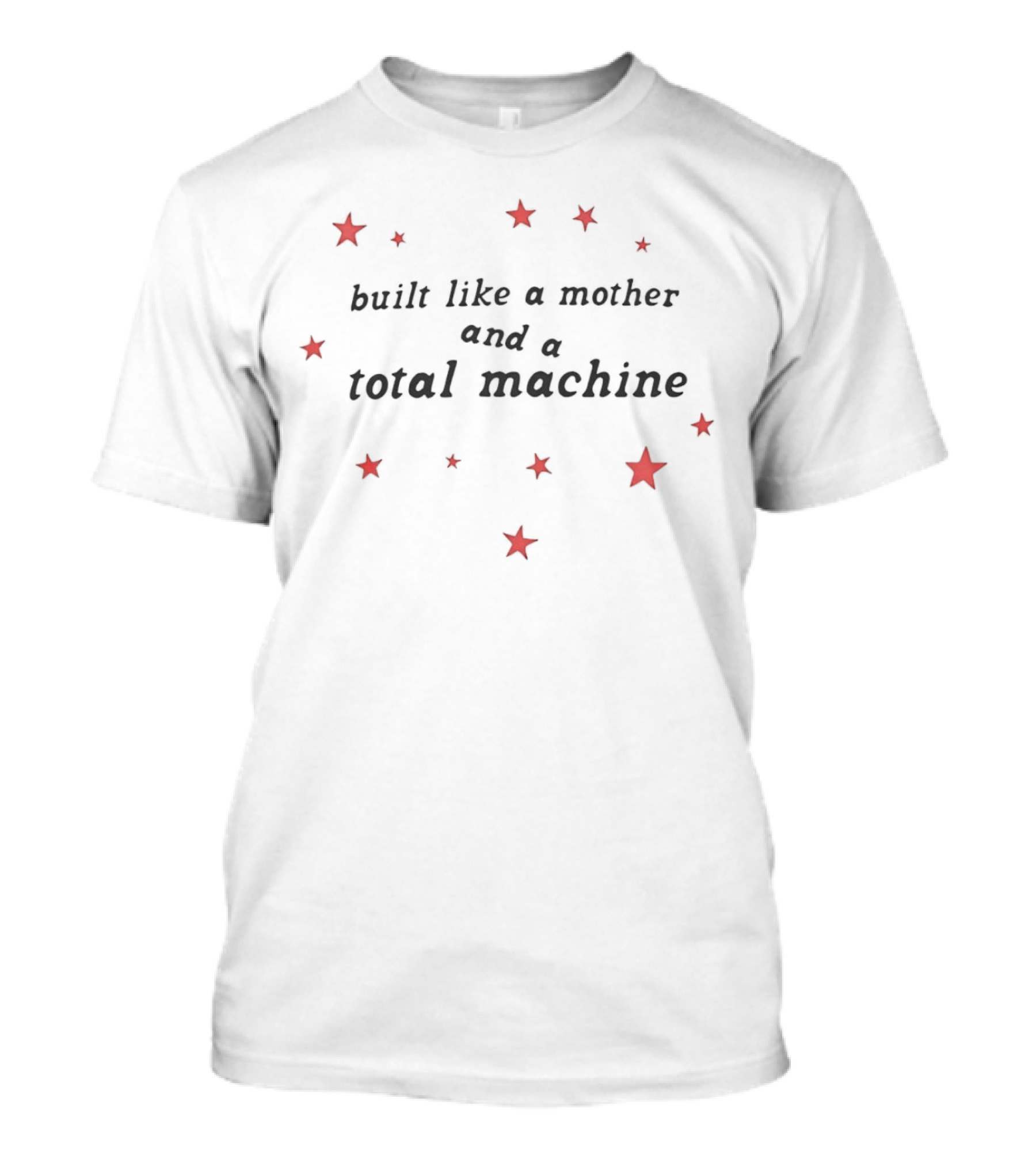 The Built Like a Mother and a Total Machine Surrounded by Red Stars T-shirt is designed for everyday wear and a consistent fit. Fabric is pre-shrunk ring-spun cotton with durable stitching. See the size chart below for exact measurements.