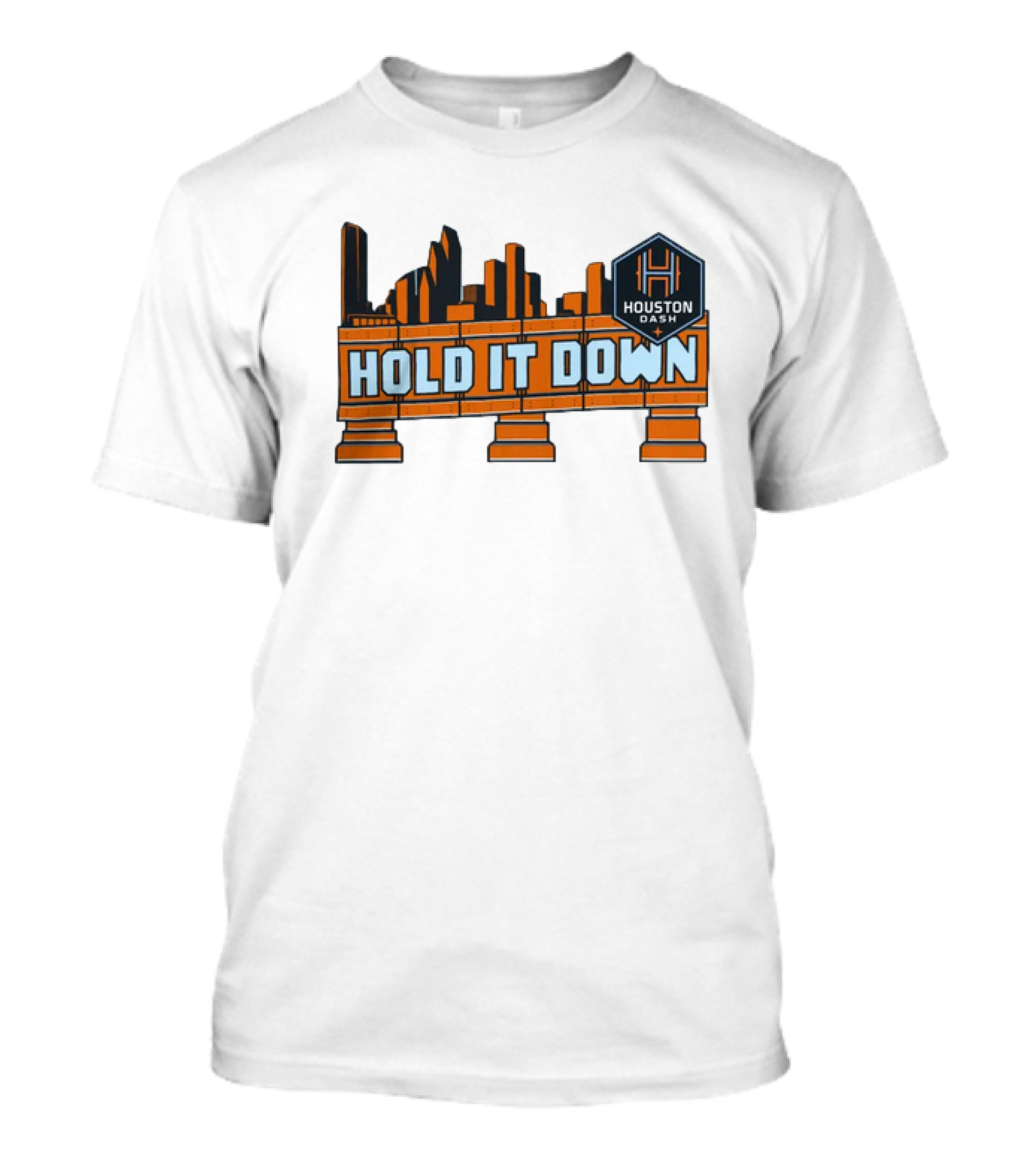 The Houston Dash Hold It Down Skyline Soccer T-shirt is designed for everyday wear and a consistent fit. Fabric is pre-shrunk ring-spun cotton with durable stitching. See the size chart below for exact measurements.