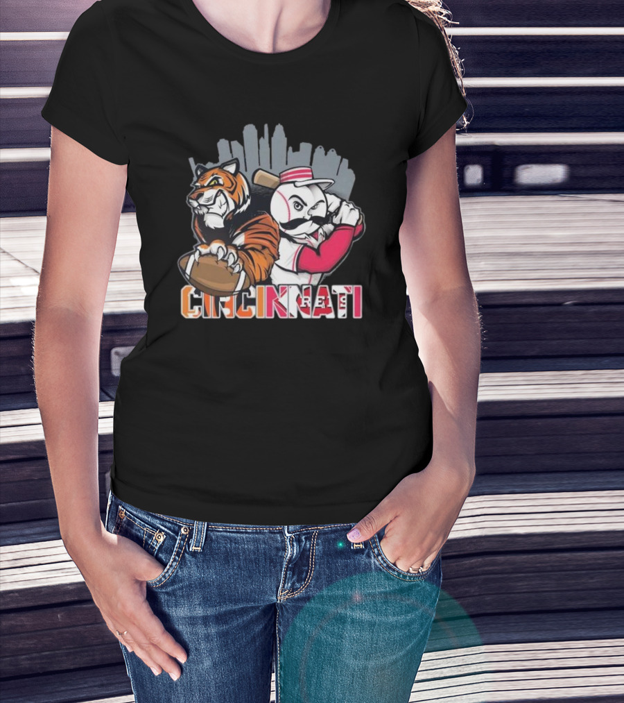 Cincinnati Bengals Tiger With Football And Mr. Redlegs Baseball Skyline T-Shirt