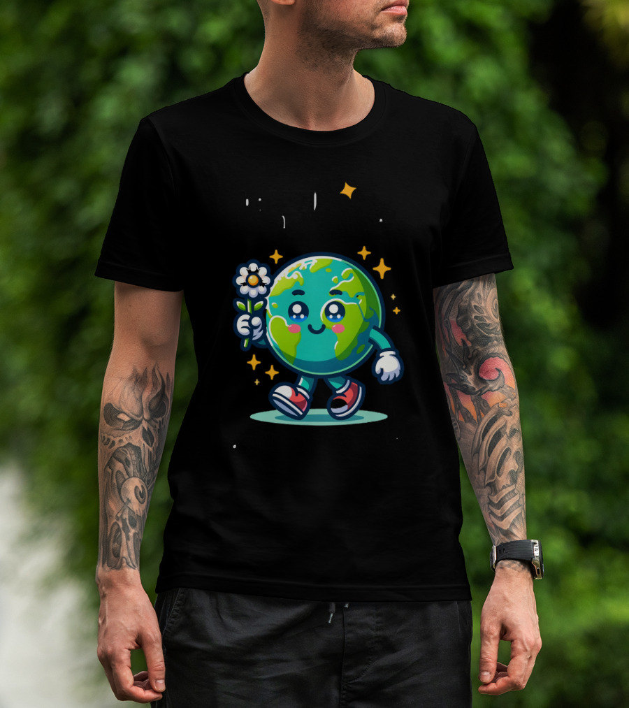 Be Kind To Our Planet And To Others Cute Earth Character With Flower And Stars T-Shirt