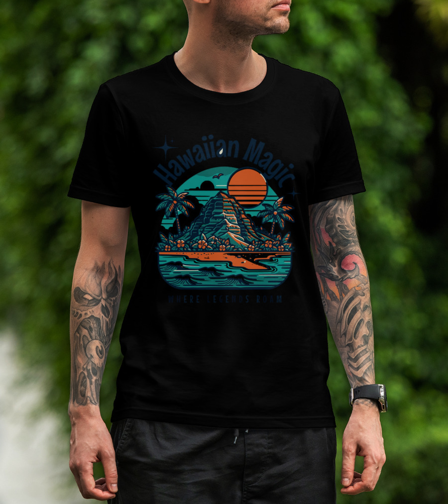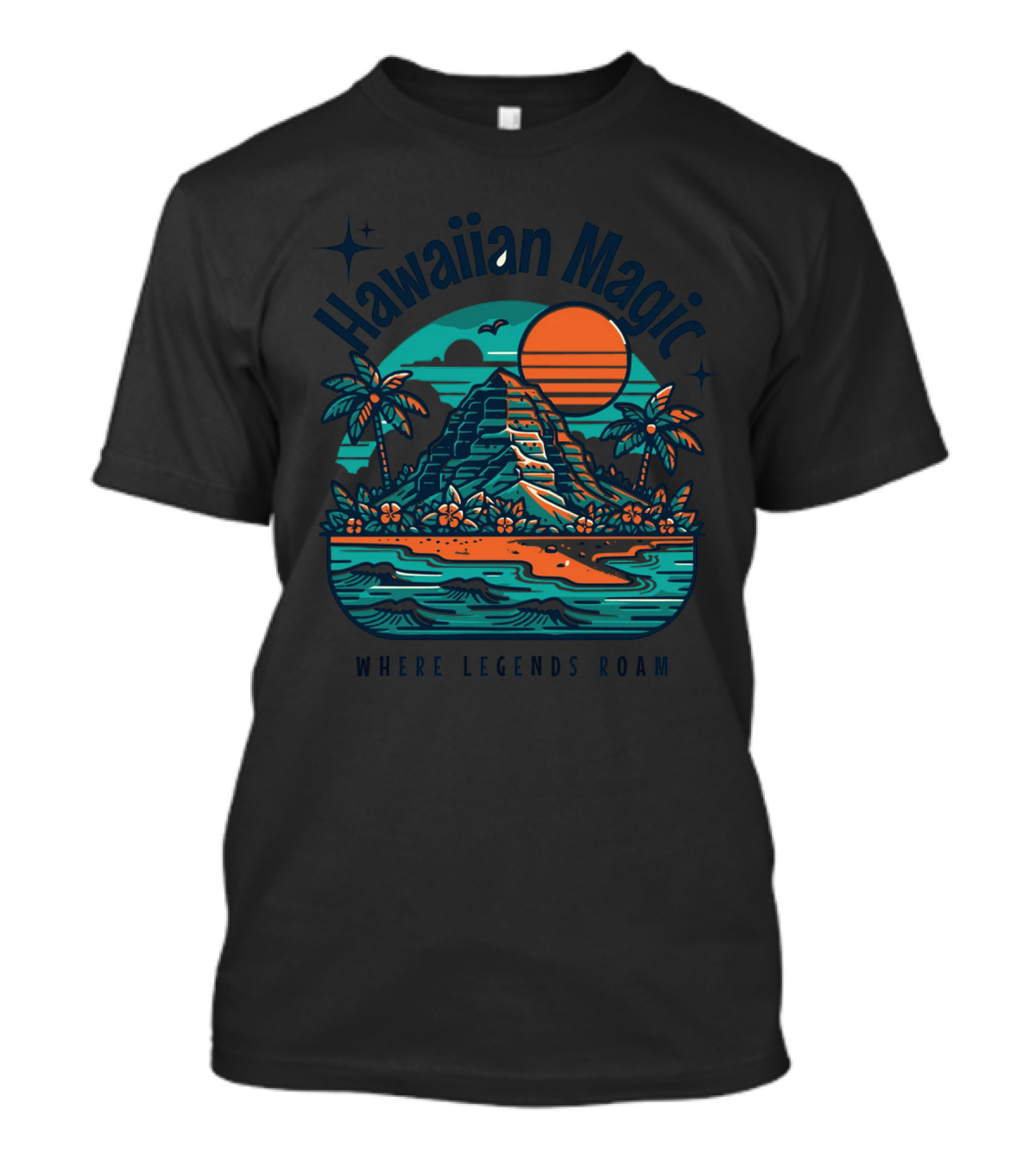 The Hawaiian Magic Where Legends Roam Tropical Sunset Scenic Ocean View T-shirt is designed for everyday wear and a consistent fit. Fabric is pre-shrunk ring-spun cotton with durable stitching. See the size chart below for exact measurements.
