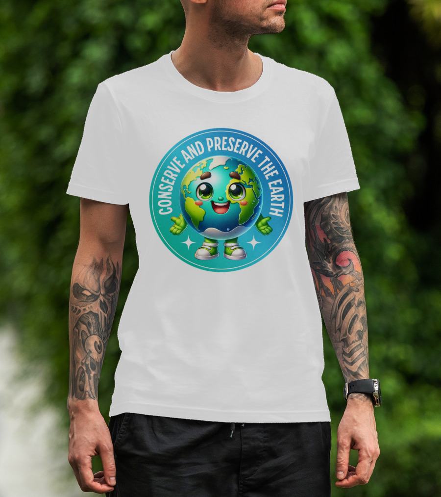 The Conserve and Preserve the Earth Retro Earth Day Celebration Mascot T-shirt is designed for everyday wear and a consistent fit. Fabric is pre-shrunk ring-spun cotton with durable stitching. See the size chart below for exact measurements.