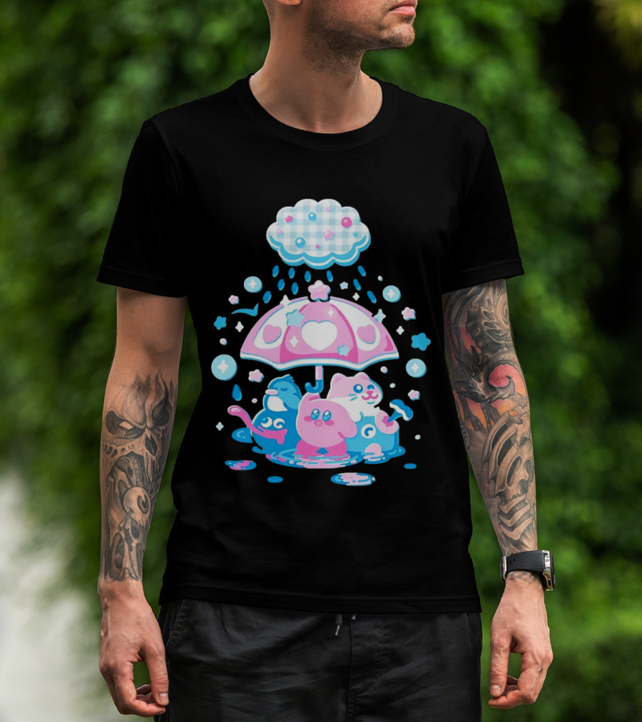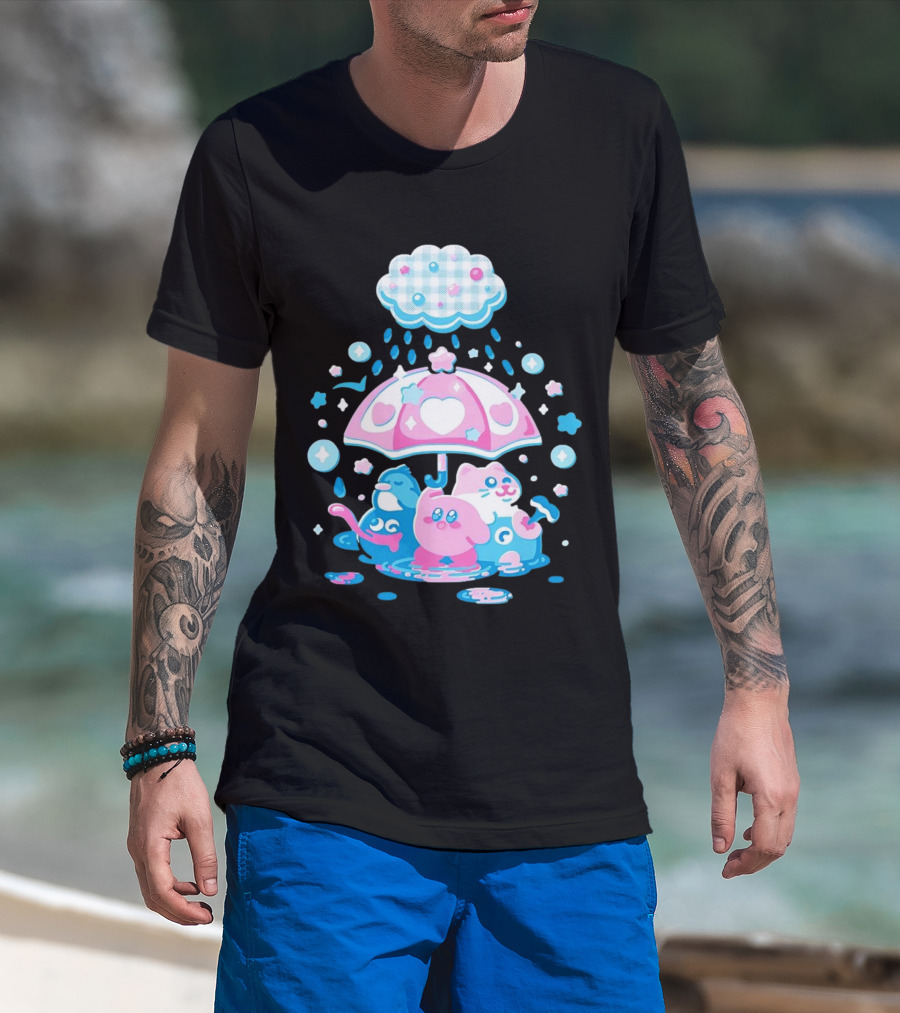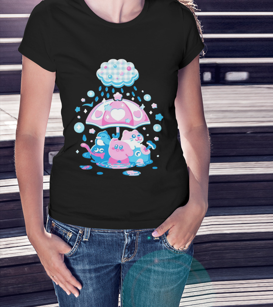 Kirby Gooey And Rick Under Heart Umbrella With Stars And Raindrops T-Shirt