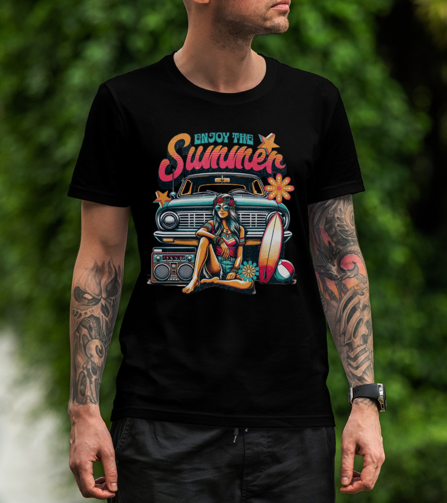 The Enjoy the Summer Hippie Girl Surf Van Beach Vibes Vintage Boombox T-shirt is designed for everyday wear and a consistent fit. Fabric is pre-shrunk ring-spun cotton with durable stitching. See the size chart below for exact measurements.