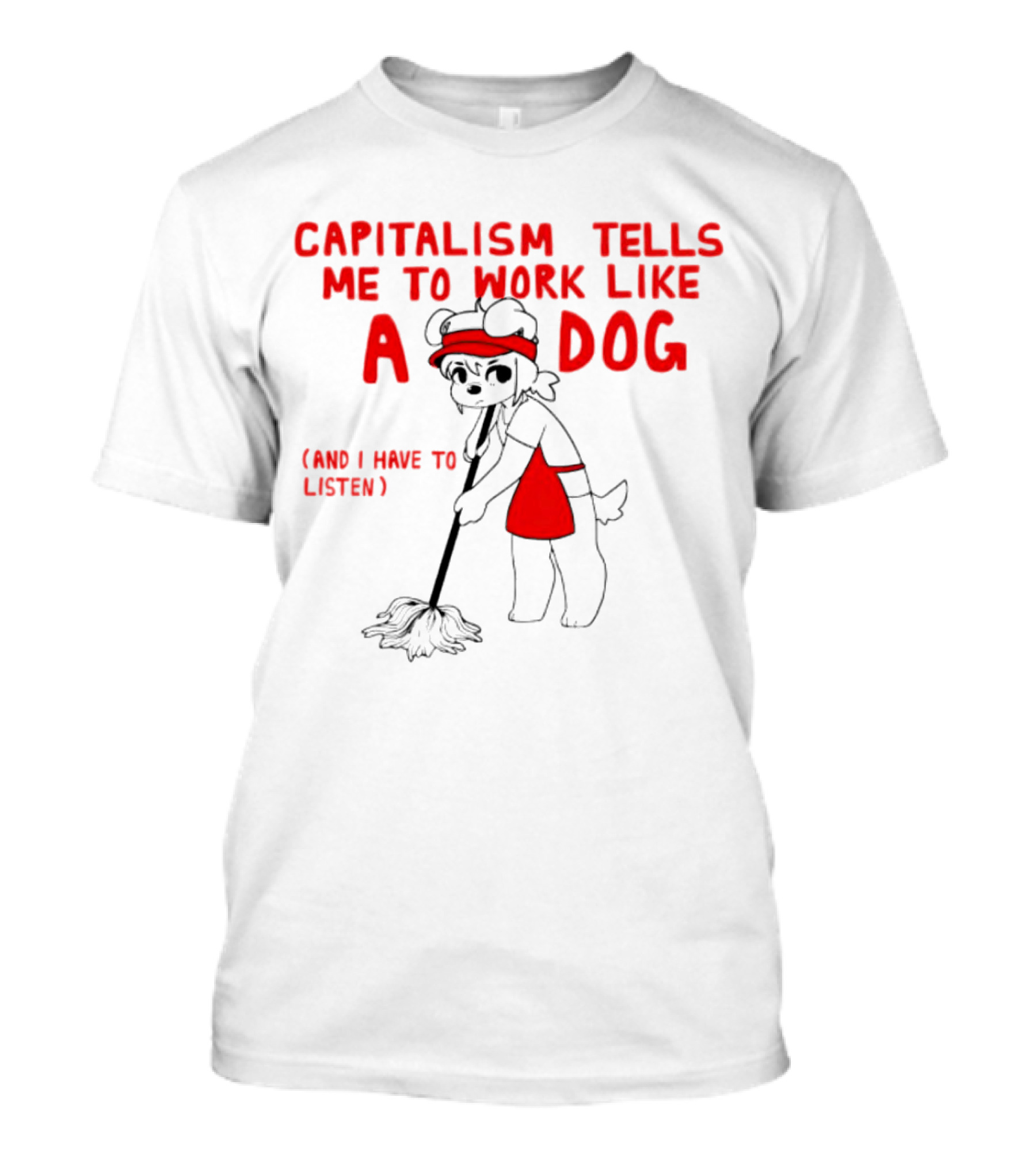 The CAPITALISM TELLS ME TO WORK LIKE A DOG (AND I HAVE TO LISTEN) T-shirt is designed for everyday wear and a consistent fit. Fabric is pre-shrunk ring-spun cotton with durable stitching. See the size chart below for exact measurements.