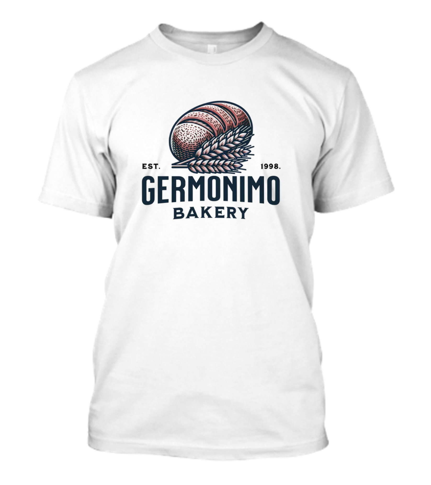 The GERMONIMO BAKERY EST. 1998 VINTAGE STYLE BREAD AND WHEAT T-shirt is designed for everyday wear and a consistent fit. Fabric is pre-shrunk ring-spun cotton with durable stitching. See the size chart below for exact measurements.