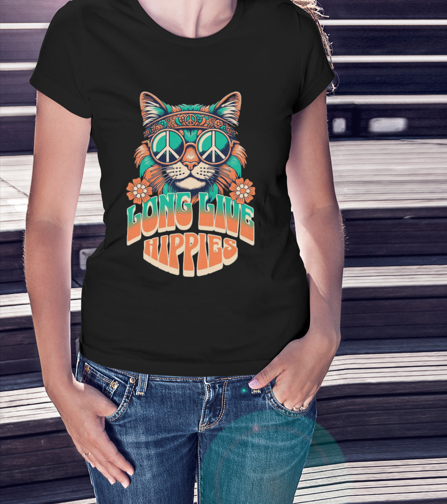 Long Live Hippies Cat With Peace Sign Glasses And Flowers T-Shirt