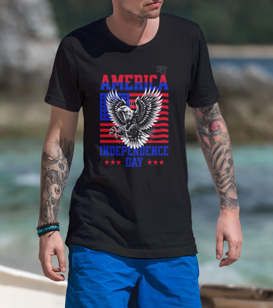 The America Independence Day Eagle Flag Stars T-shirt is designed for everyday wear and a consistent fit. Fabric is pre-shrunk ring-spun cotton with durable stitching. See the size chart below for exact measurements.