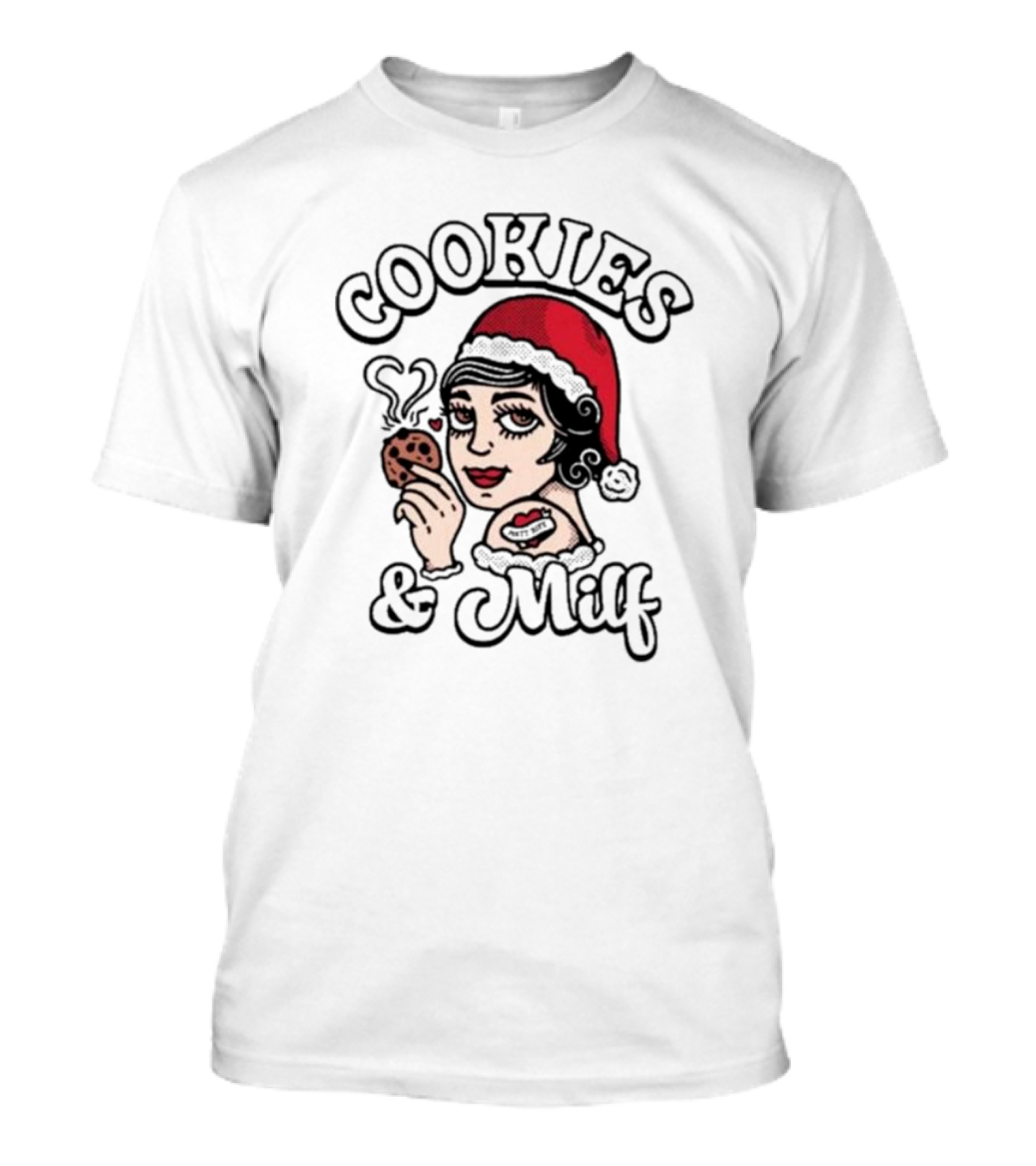 The Cookies and Milf Retro Style Santa Hat Woman with Heart and Chocolate Chip Cookie T-shirt is designed for everyday wear and a consistent fit. Fabric is pre-shrunk ring-spun cotton with durable stitching. See the size chart below for exact measurements.