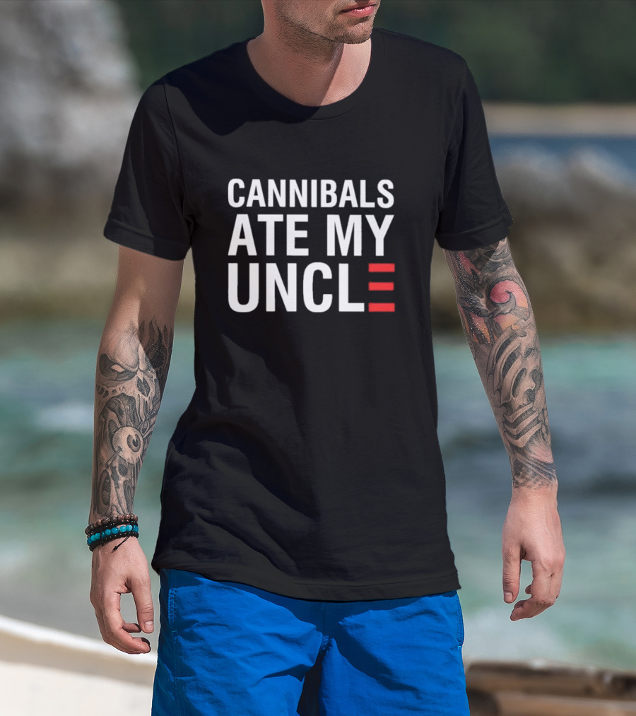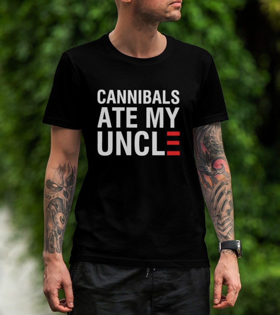 Cannibals Ate My Uncle White Text Red Stripes T-Shirt