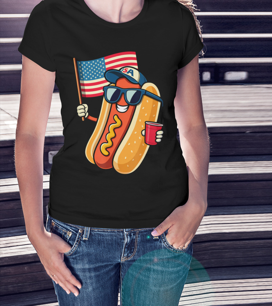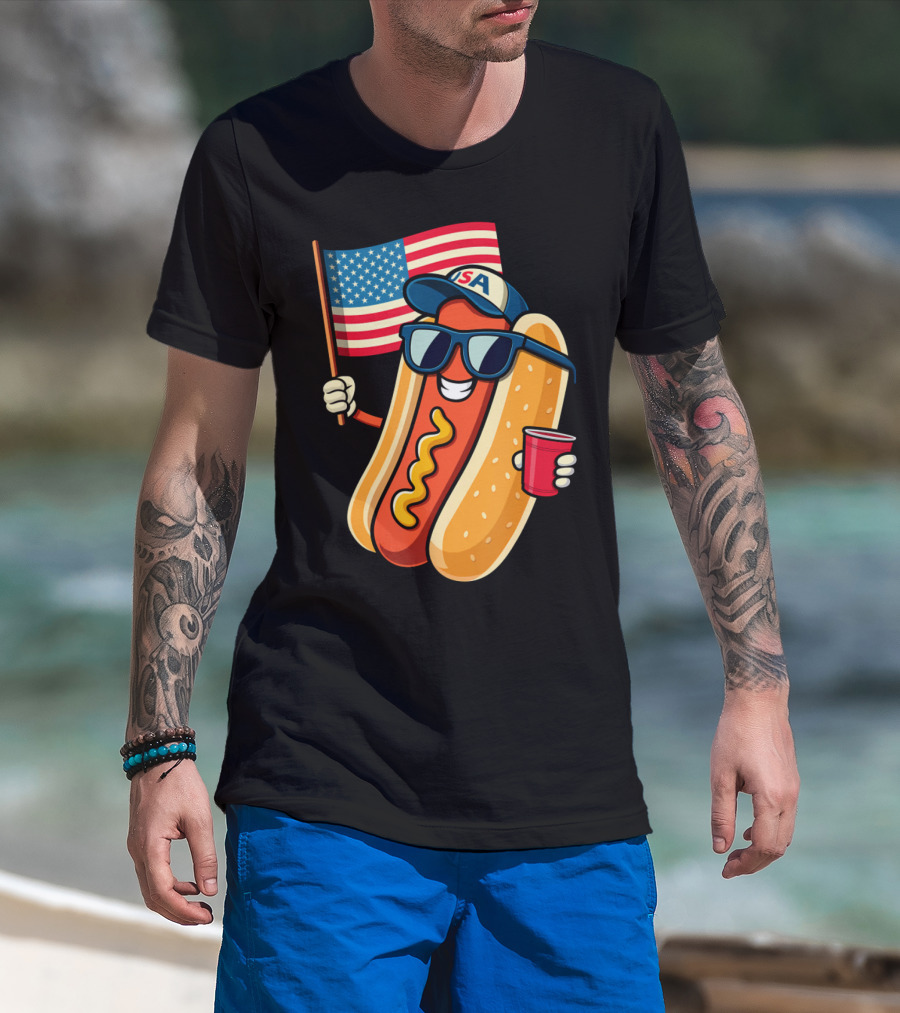 Fourth Of July USA Hotdog With American Flag And Sunglasses T-Shirt