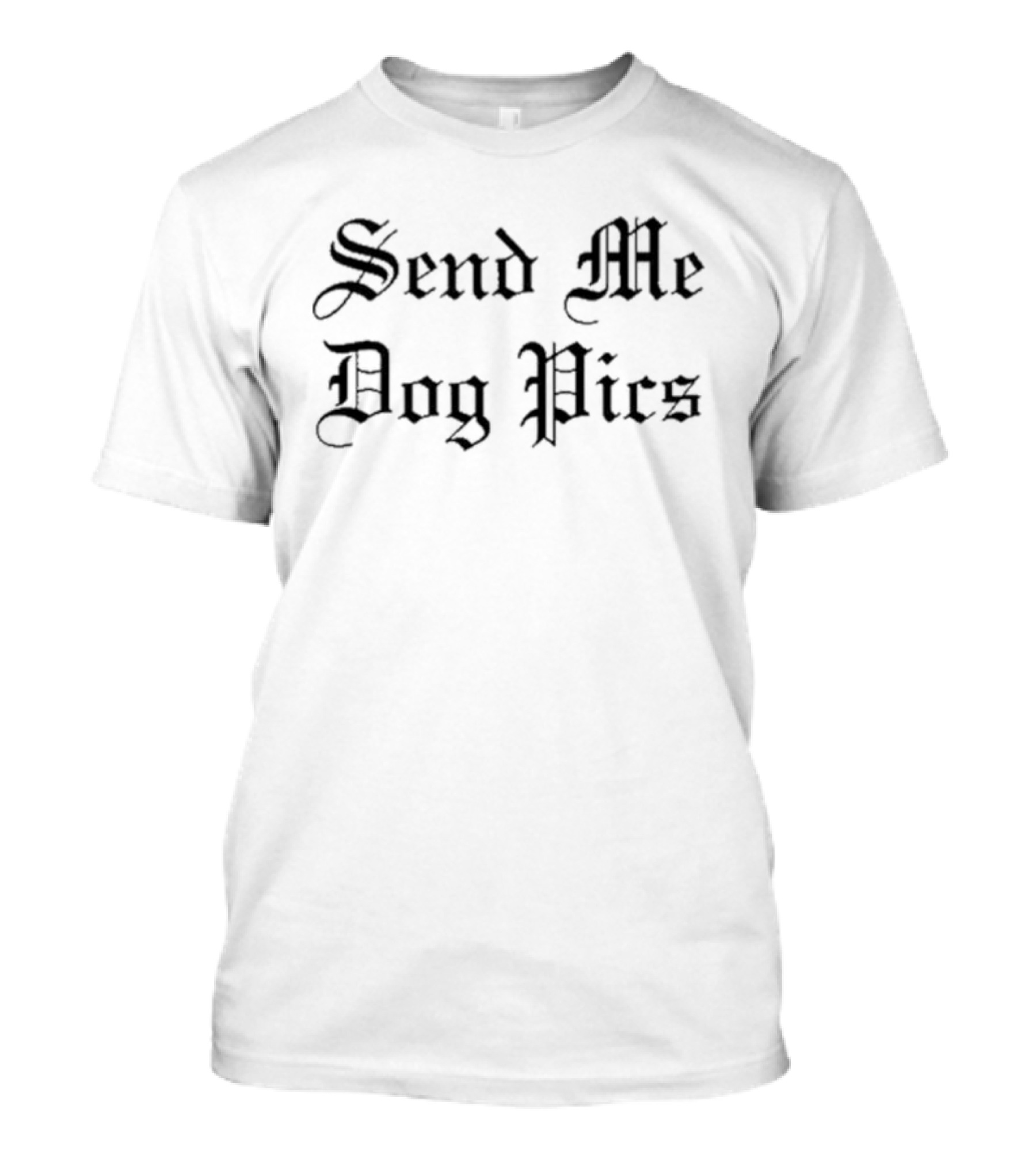 The Send Me Dog Pics Gothic Font T-shirt is designed for everyday wear and a consistent fit. Fabric is pre-shrunk ring-spun cotton with durable stitching. See the size chart below for exact measurements.