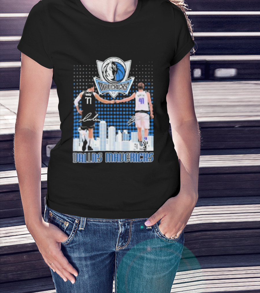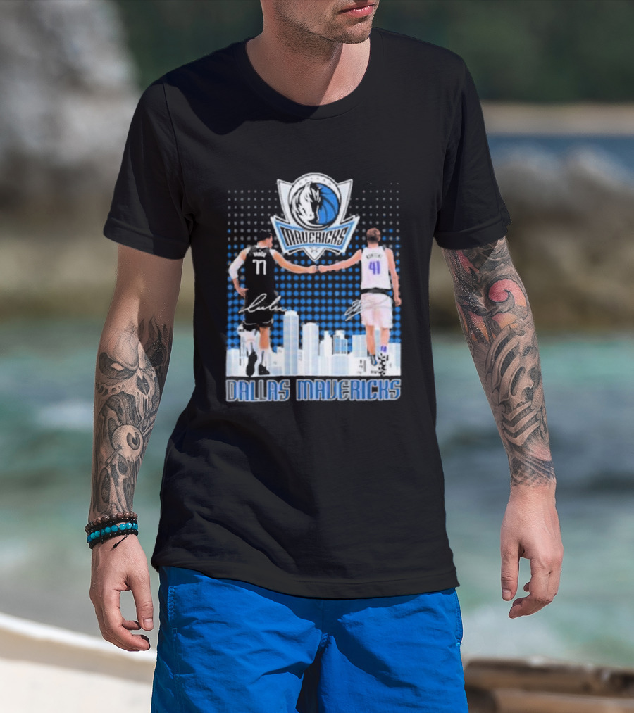 Dallas Mavericks Luka Doncic Dirk Nowitzki Handshake Signatures Skyline T-Shirt