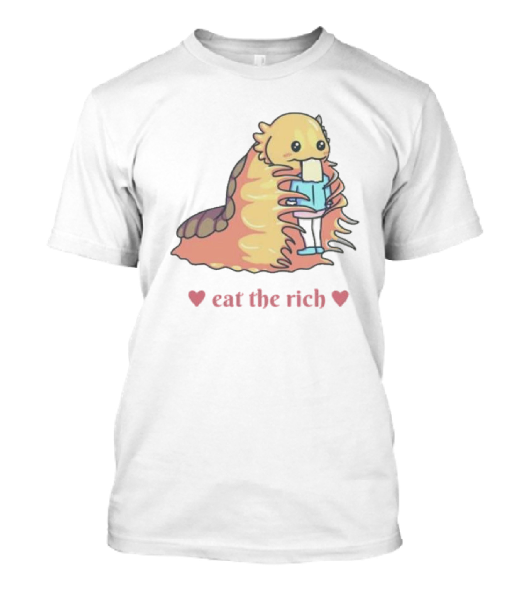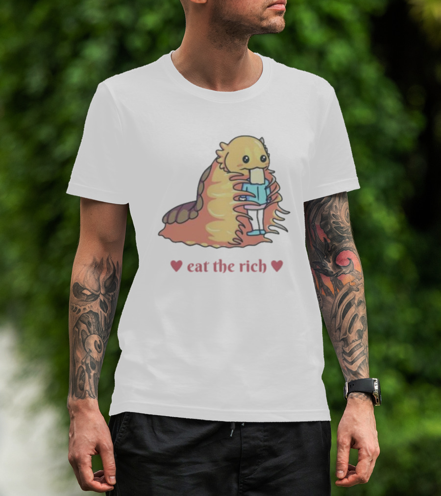 The The Space Slug Eat The Rich Heart T-shirt is designed for everyday wear and a consistent fit. Fabric is pre-shrunk ring-spun cotton with durable stitching. See the size chart below for exact measurements.