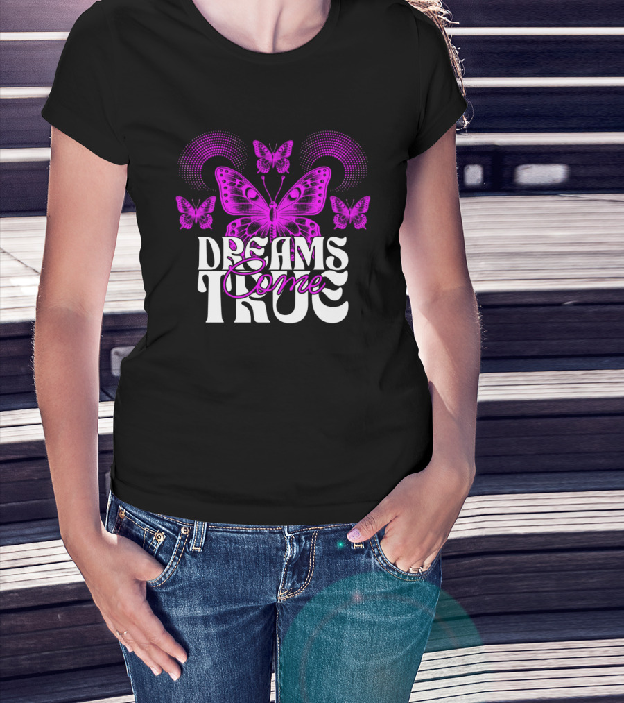 The Dreams Come True Vibrant Pink Butterflies Psychedelic T-shirt is designed for everyday wear and a consistent fit. Fabric is pre-shrunk ring-spun cotton with durable stitching. See the size chart below for exact measurements.