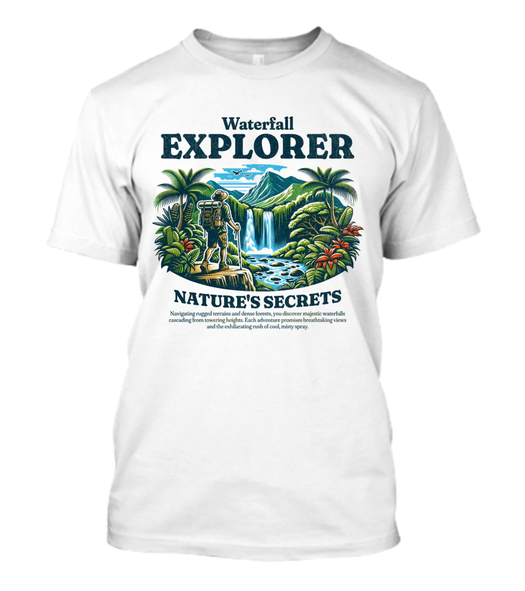 The Waterfall Explorer Nature's Secrets Discover Mysteries Towering Heights Breathtaking Views T-shirt is designed for everyday wear and a consistent fit. Fabric is pre-shrunk ring-spun cotton with durable stitching. See the size chart below for exact measurements.