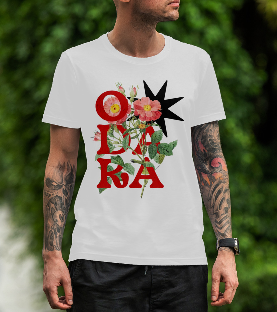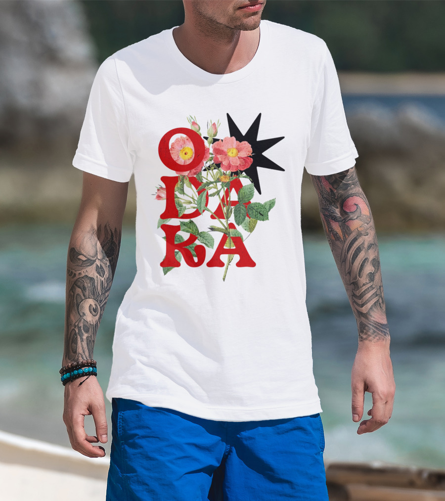ODARA Bold Floral Art With Red Letters And Pink Flowers T-Shirt