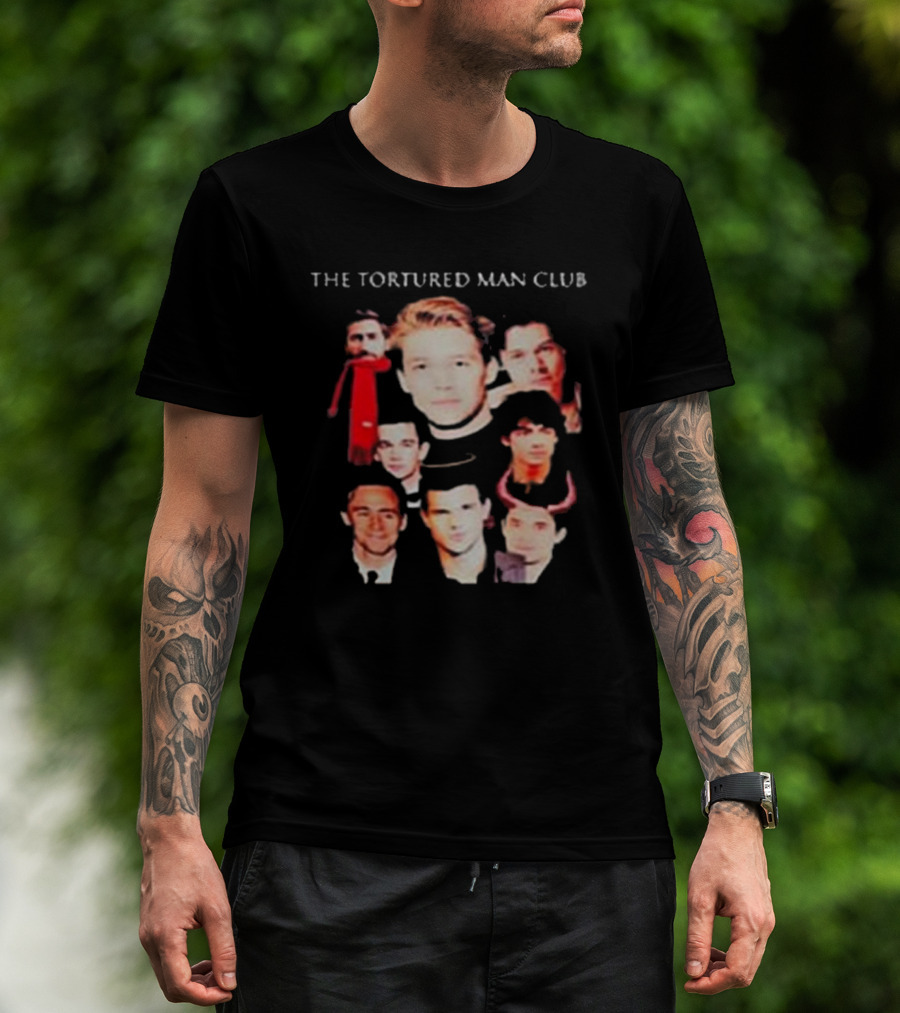 The The Tortured Man Club: Collage of Faces with Red Scarf and Horns T-shirt is designed for everyday wear and a consistent fit. Fabric is pre-shrunk ring-spun cotton with durable stitching. See the size chart below for exact measurements.