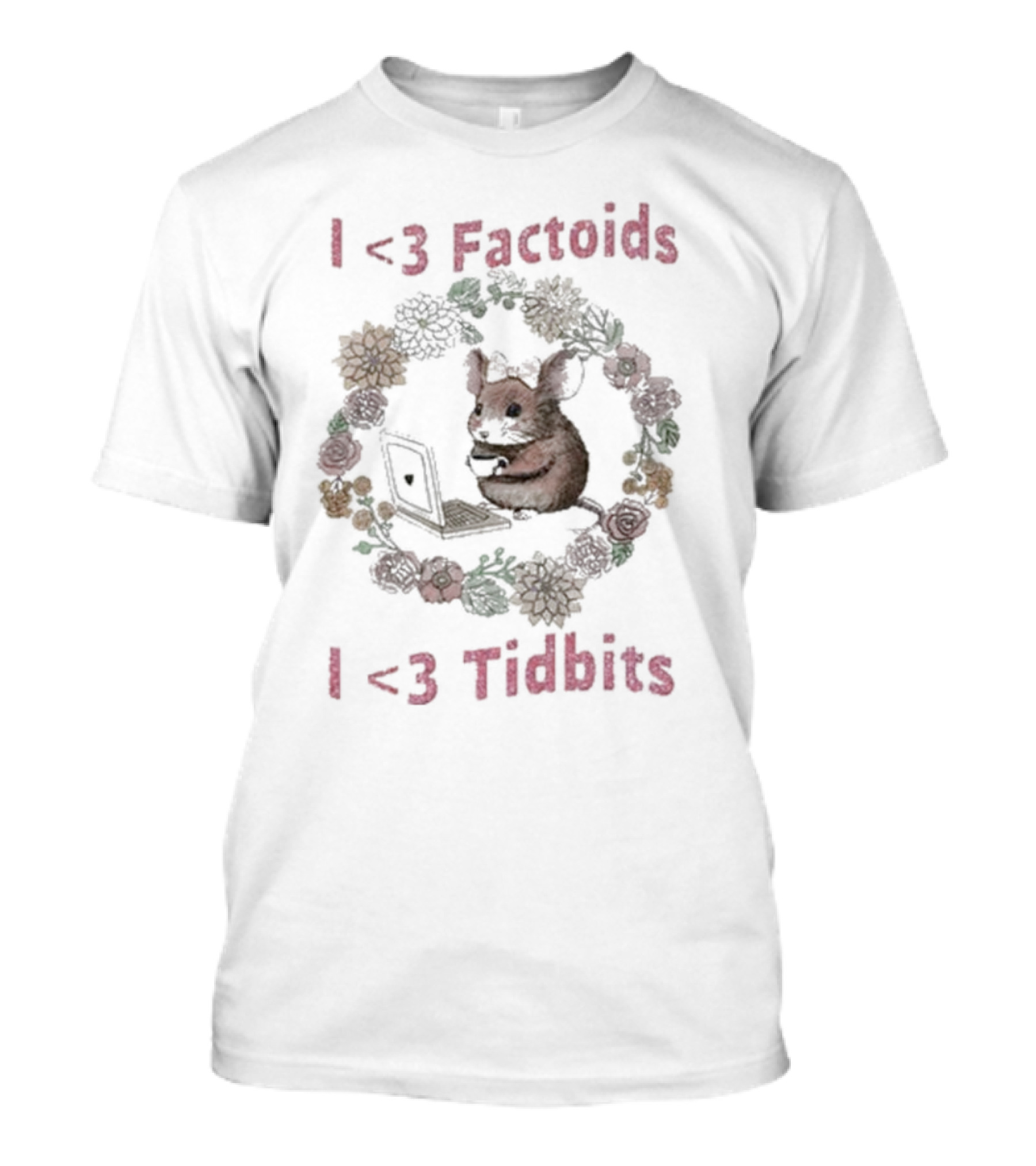I Love Factoids I Love Tidbits Cute Mouse With Laptop And Floral Border T-Shirt