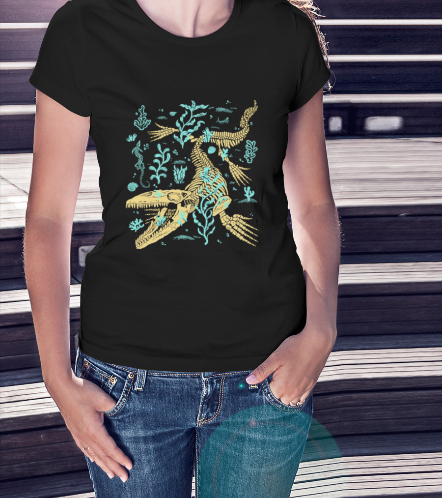 Mosasaurus Fossils Fitas Underwater Skeleton And Seaweed Scene T-Shirt