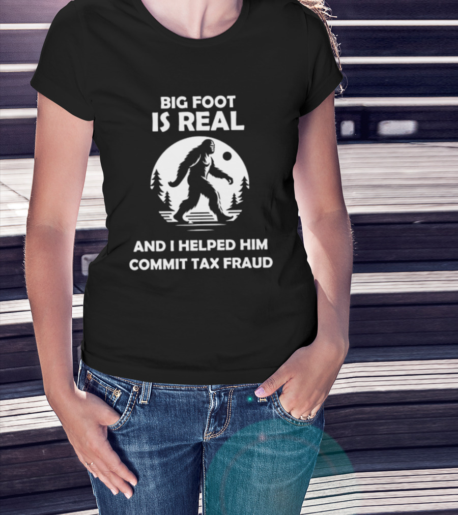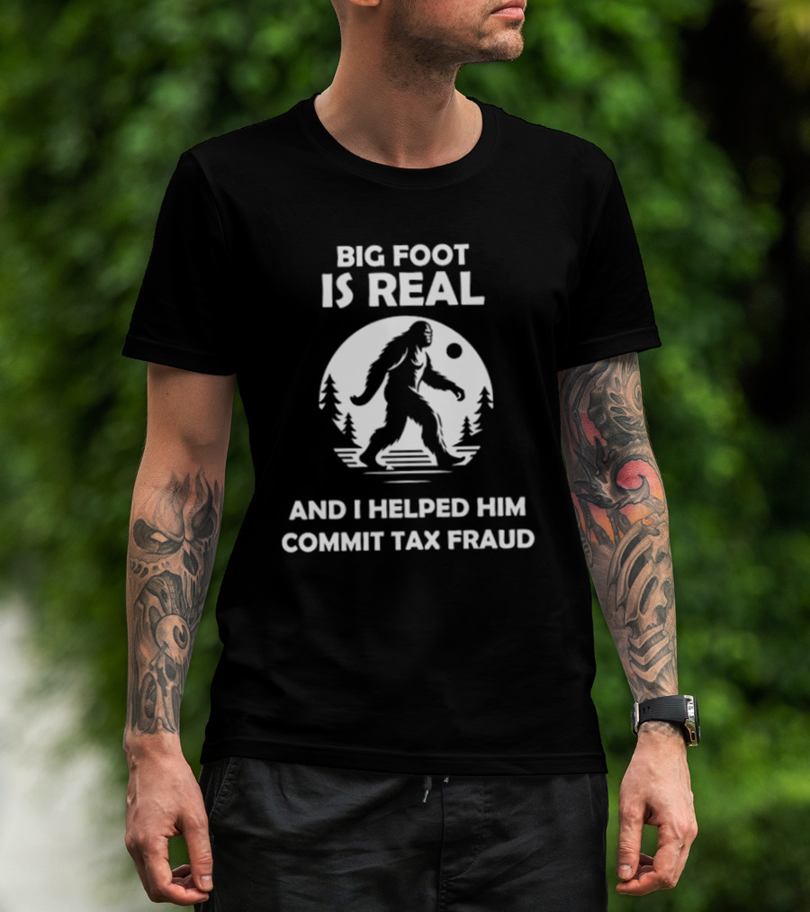 The Bigfoot Is Real and I Helped Him Commit Tax Fraud The Irony Closet T-shirt is designed for everyday wear and a consistent fit. Fabric is pre-shrunk ring-spun cotton with durable stitching. See the size chart below for exact measurements.
