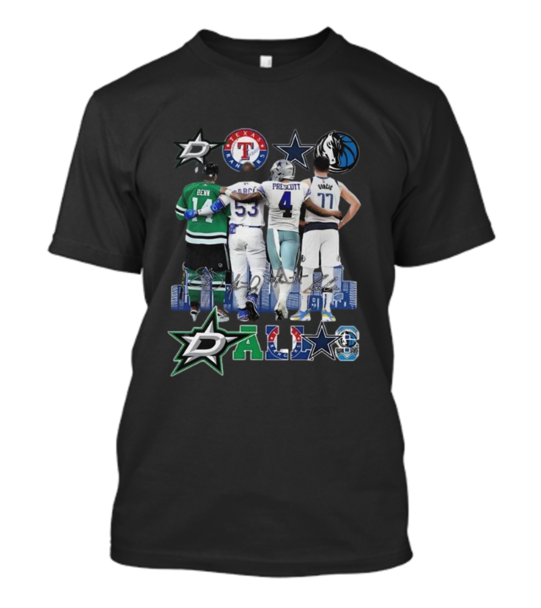 Dallas Mavericks Doncic Stars Benn Texas Rangers Cowboys Prescott Skyline Signatures T-Shirt