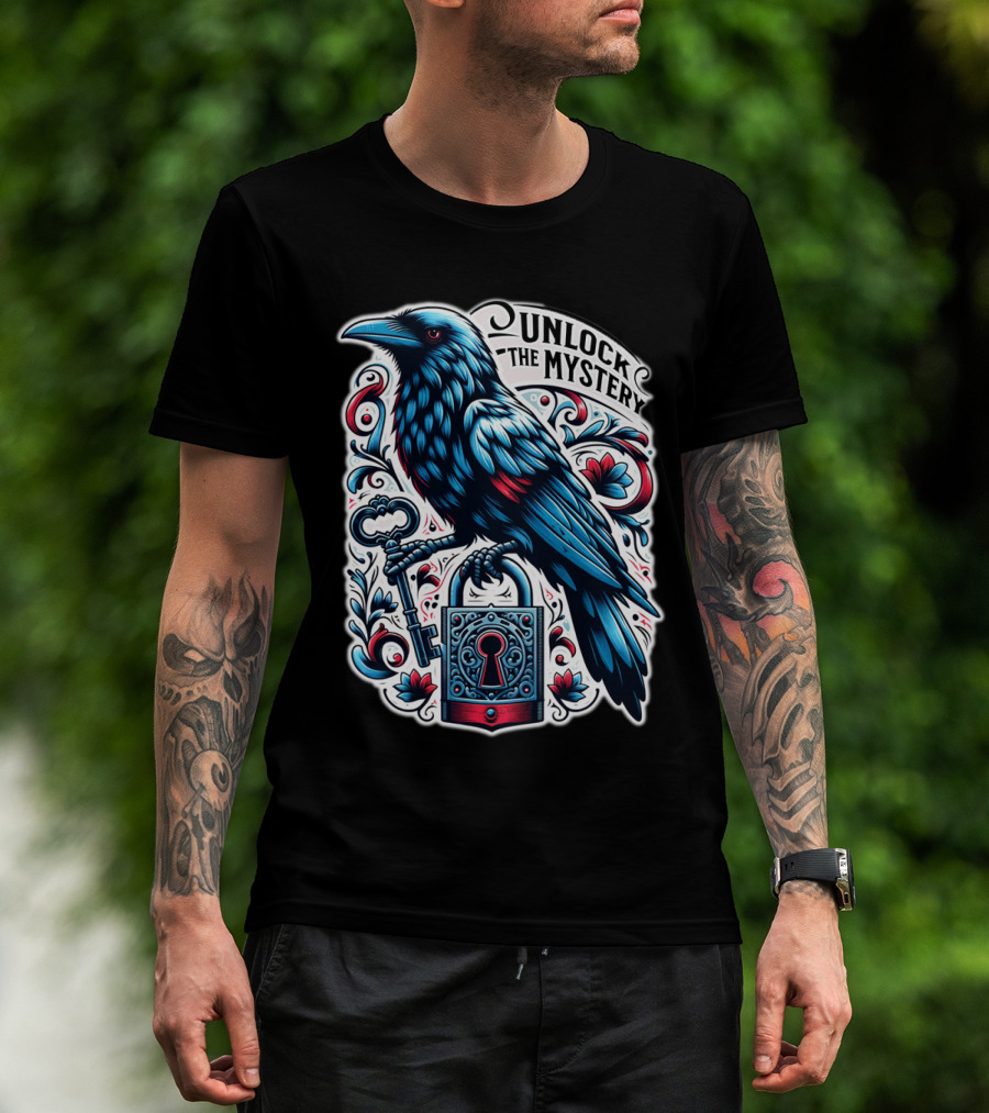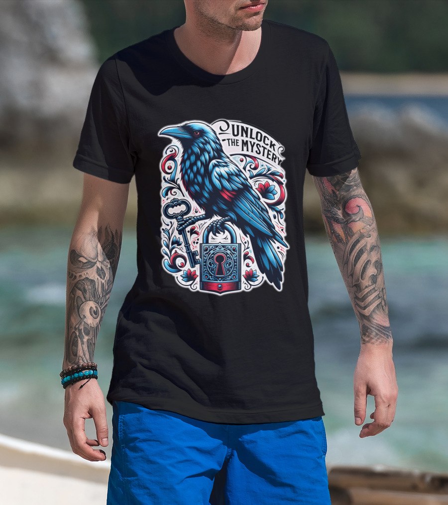 The Unlock The Mystery Raven Holding Key and Lock with Ornate Floral T-shirt is designed for everyday wear and a consistent fit. Fabric is pre-shrunk ring-spun cotton with durable stitching. See the size chart below for exact measurements.