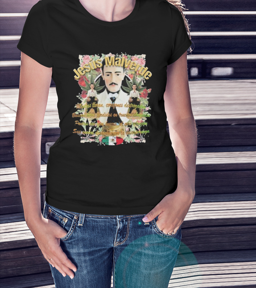 Jesús Malverde Iconic Figure With Flowers And Mexican Flag T-Shirt