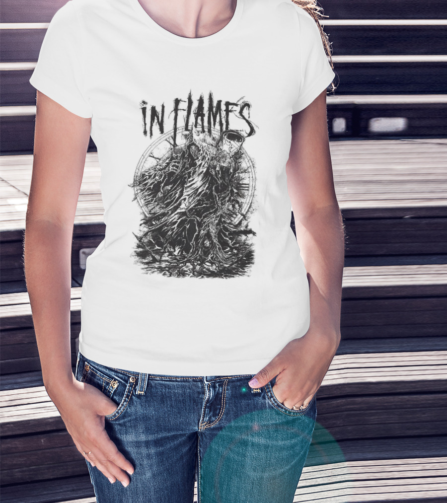 The In Flames Cloaked Ghoul Dark Shrouded Figure with Clock Background T-shirt is designed for everyday wear and a consistent fit. Fabric is pre-shrunk ring-spun cotton with durable stitching. See the size chart below for exact measurements.