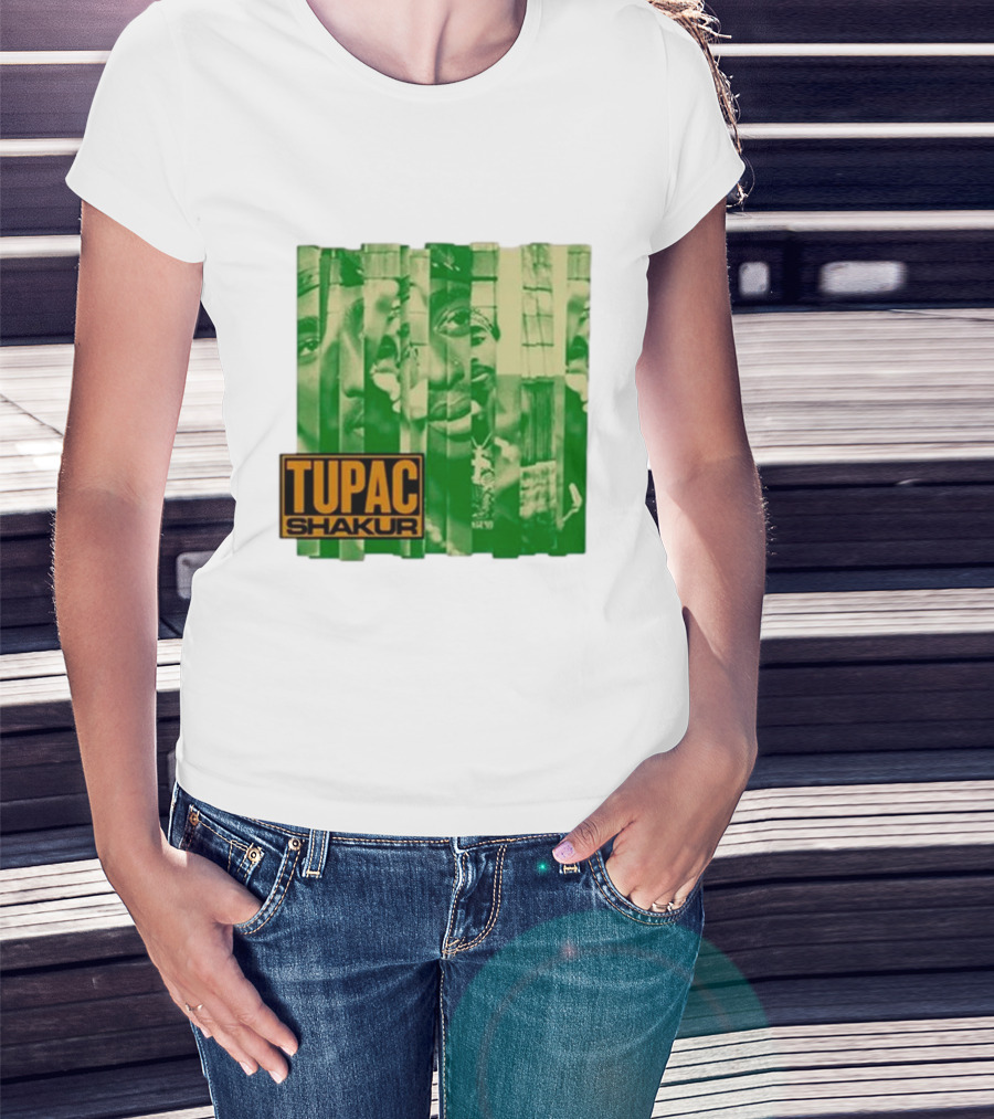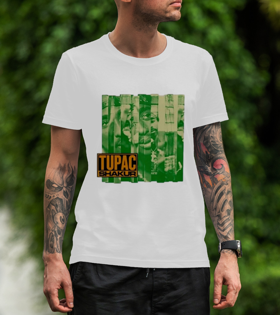 The Tupac Shakur Green Photo Collage T-shirt is designed for everyday wear and a consistent fit. Fabric is pre-shrunk ring-spun cotton with durable stitching. See the size chart below for exact measurements.