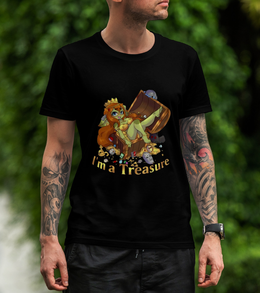 The Gob Mode I'm A Treasure Chibi Goblin in Treasure Chest T-shirt is designed for everyday wear and a consistent fit. Fabric is pre-shrunk ring-spun cotton with durable stitching. See the size chart below for exact measurements.