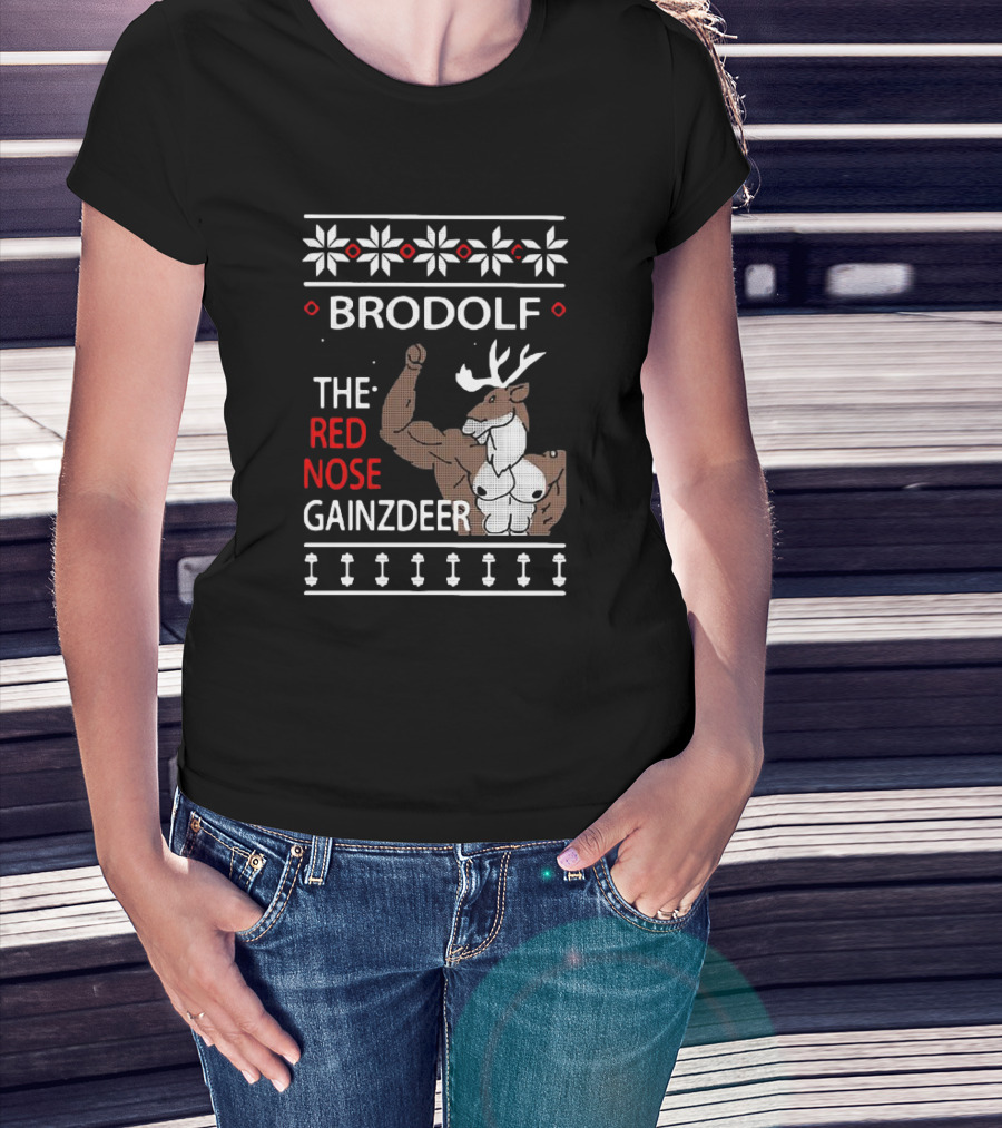 Brodolf The Red Nose Muscle Gainz Deer Christmas T-Shirt