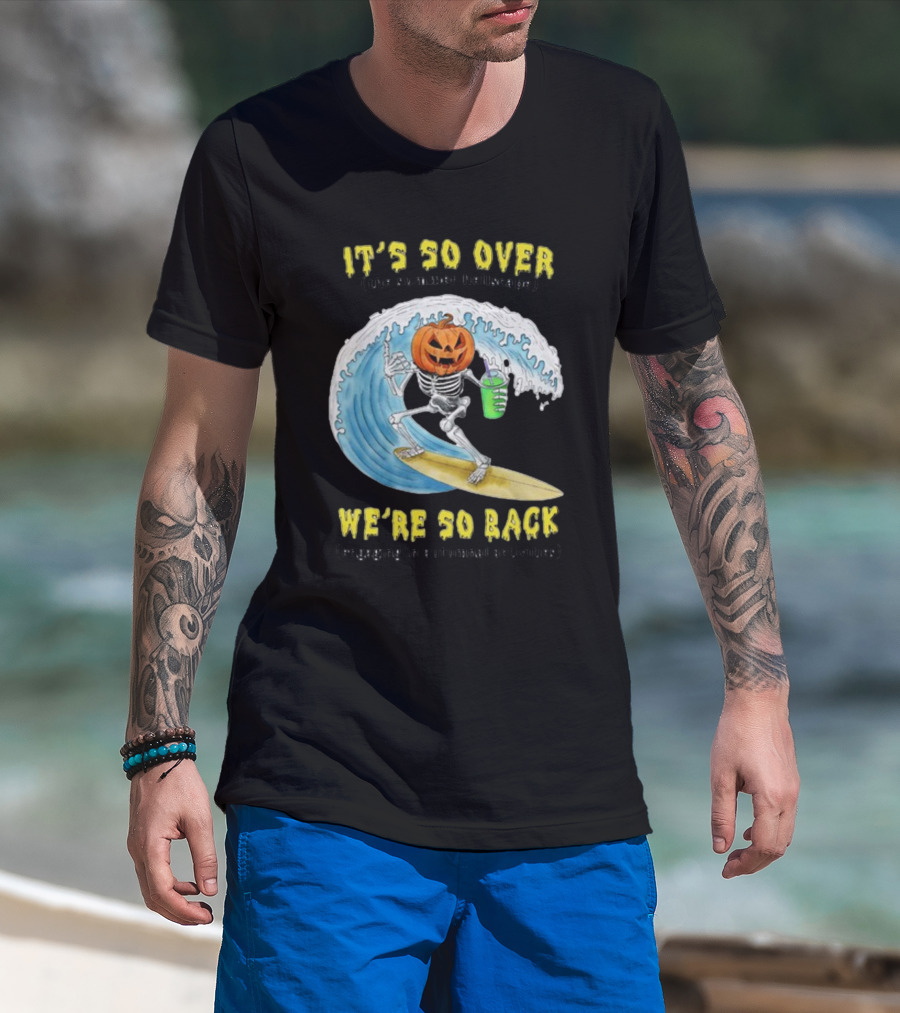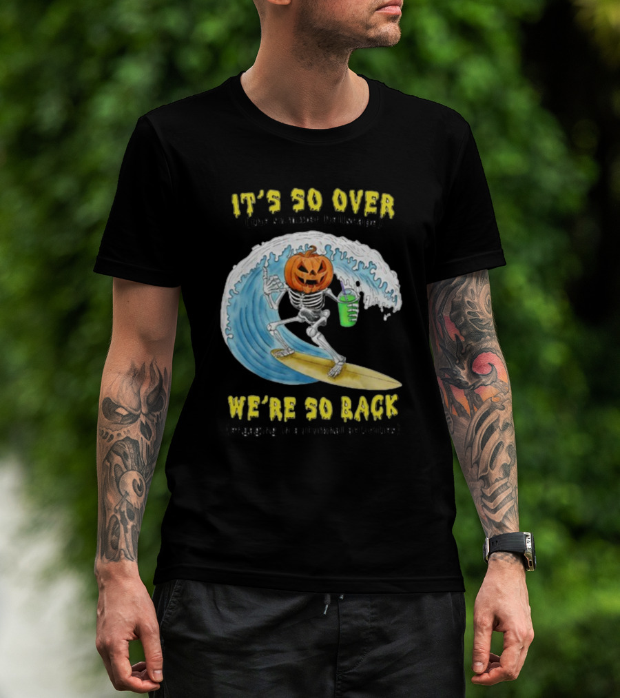It's So Over The Summer Hellscape We're So Back Engaging In Autumnal Activities Skeleton Surfer Pumpkin Head T-Shirt