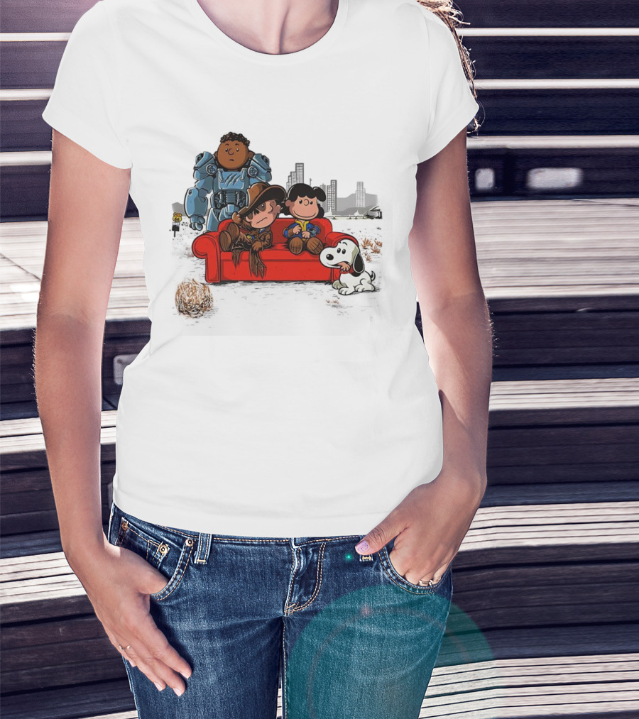 Peanuts Characters On Red Couch With Fallout Power Armor In Apocalypse Scene T-Shirt