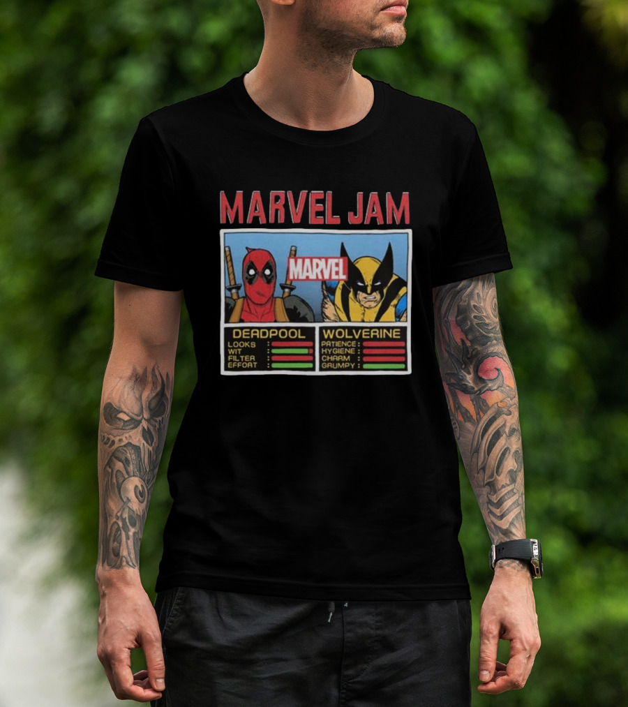Deadpool Wolverine Marvel Jam Comic Character Stats T-Shirt