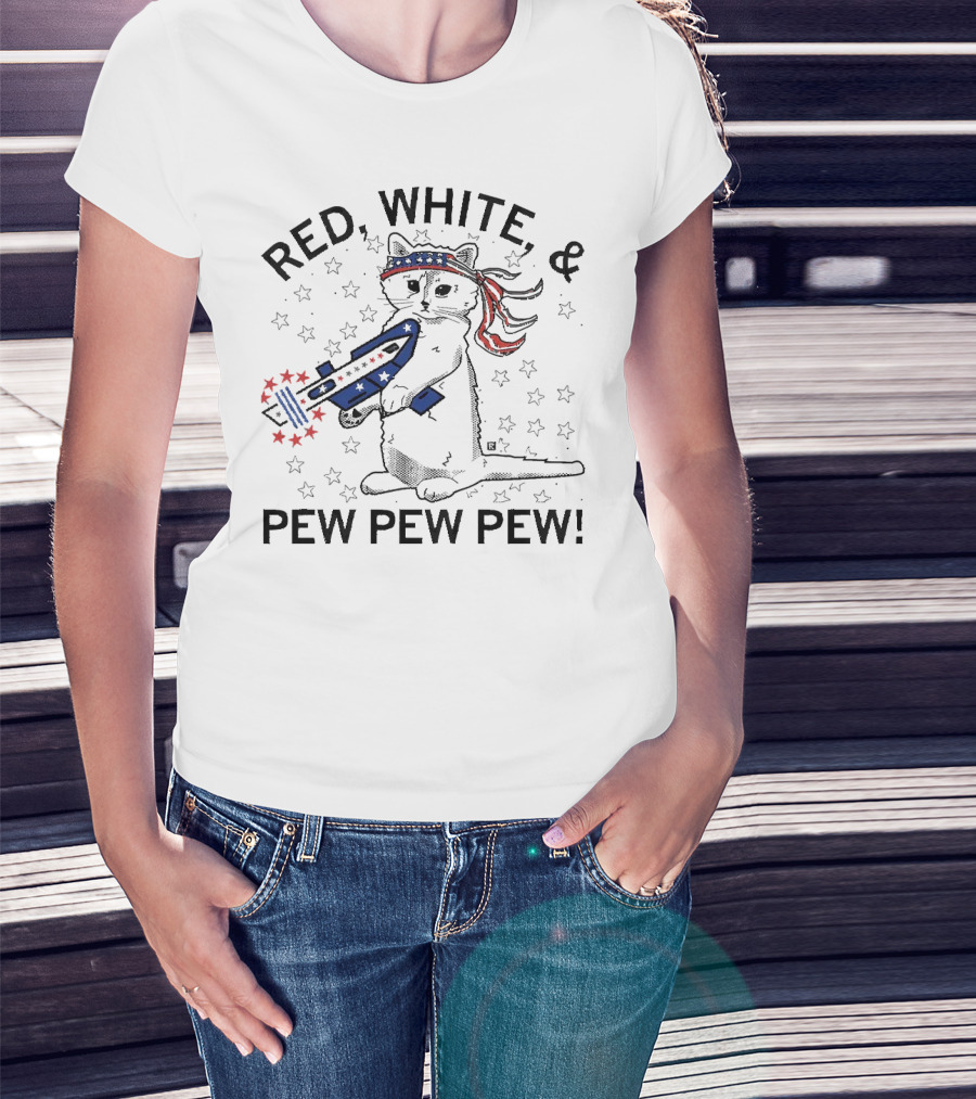 Red White And Pew Pew Pew Cat With Stars And Stripes Headband And Laser Gun T-Shirt