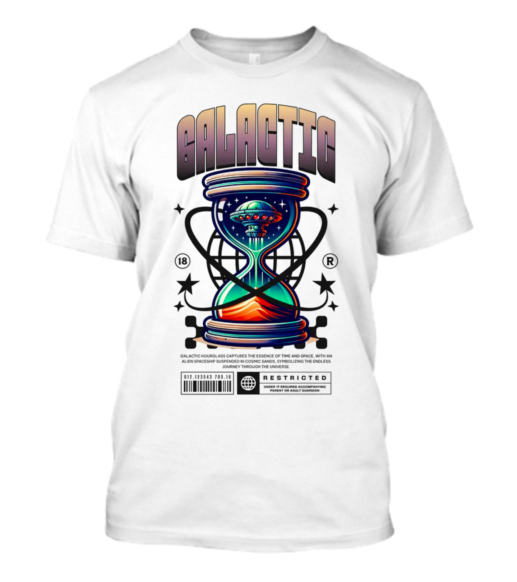 The Galactic UFO in Restriction Hourglass T-shirt is designed for everyday wear and a consistent fit. Fabric is pre-shrunk ring-spun cotton with durable stitching. See the size chart below for exact measurements.