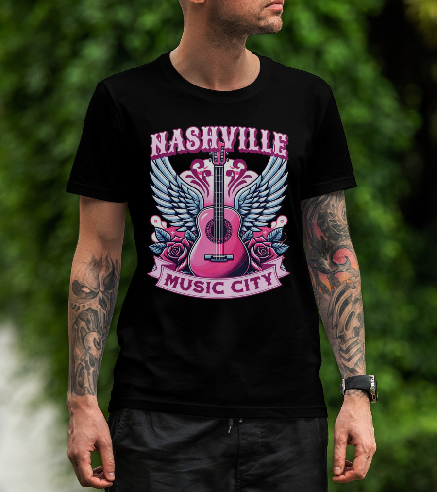 Nashville Music City Pink Guitar Wings Roses T-Shirt