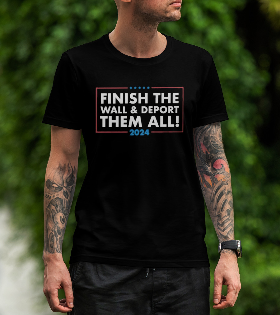 The Finish The Wall Deport Them All T-shirt is designed for everyday wear and a consistent fit. Fabric is pre-shrunk ring-spun cotton with durable stitching. See the size chart below for exact measurements.